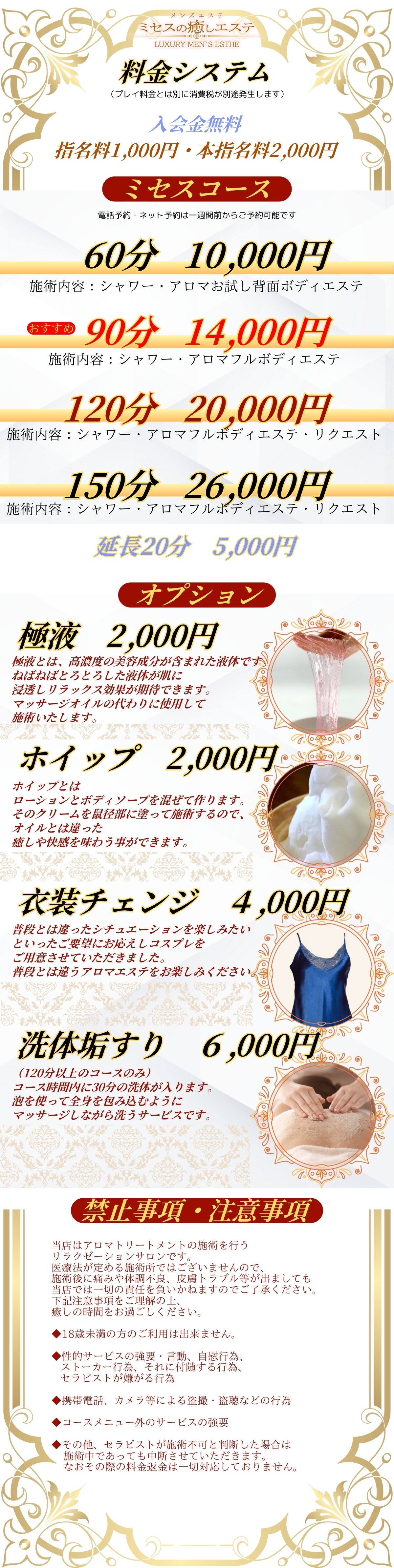 ミセス癒しエステの料金ページでは、新橋メンズエステの中でも分かりやすく安心できる明瞭会計の料金システムをご案内しています。当店は完全個室のプライベート空間で、